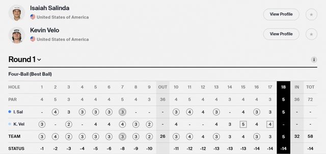 샐리다와 벨로는 보기 없이 이글 1개, 버디 12개로 14언더파 58타를 쳐 덴마크 형제 니콜라이와 라스무스 호이고르를 1타 차로 제치고 단독선두에 나섰다.