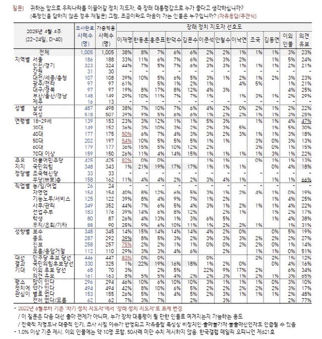이 후보 다음으론 한동훈 국민의힘 대선 경선 후보(8%)와 홍준표 국민의힘 대선 경선 후보(7%), 한덕수 대통령 권한대행 국무총리·김문수 국민의힘 대선 경선 후보(각 6%), 이준석 개혁신당 대선후보·안철수 국민의힘 대선 경선 후보(각 2%) 순이었다. 국민의힘 2차 경선에 진출한 빅4 후보들(가나다순으로 김문수·안철수·한동훈·홍준표 후보)의 지지율 합은 23%로 이재명 후보에게 오차범위(±3.1%포인트) 밖에서 뒤처졌다. 구여권 후보로 분류되는 한 대행 지지율을 합쳐도 마찬가지였다.