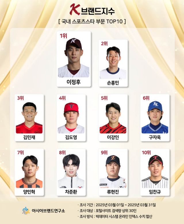 아시아브랜드연구소가 25일 발표한 자료에 따르면 이정후는 스포츠스타 부문에서 K-브랜드지수 1위를 차지했다. 이정후는 미국 메이저리그 샌프란시스코 자이언츠 소속으로 뛰고 있으며, 최근 연이은 활약으로 국내외 팬들의 주목을 받고 있다. 손흥민은 기존의 부동의 1위 자리에서 한 단계 하락한 2위를 기록했고, 김민재, 김도영, 이강인, 구자욱, 양민혁, 차준환, 류현진, 임찬규 등이 그 뒤를 이었다.