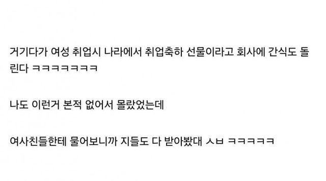여성은 취업 하면 나라에서 축하한다고 꽃이랑 떡까지 돌린다고??