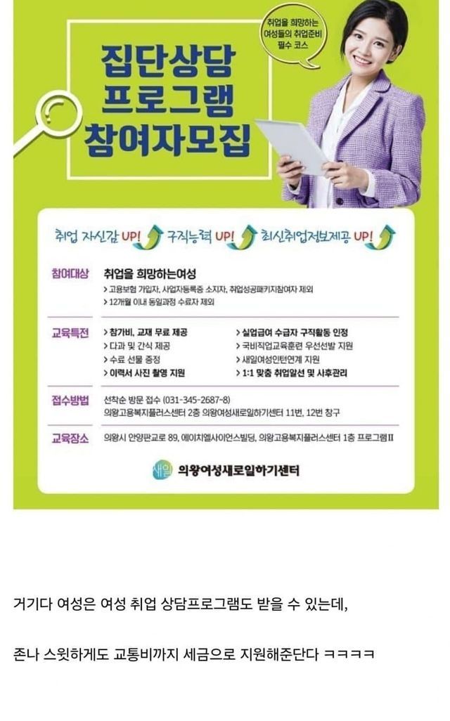 여성만 받아먹을 수 있는 취업지원 사업 존나 많다 ㅋㅋ