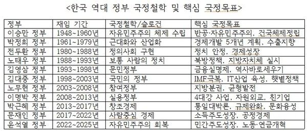 대한민국은 그동안 '잘살아보세'라는 구호로 대변되는 산업화와 '타는 목마름으로'로 대변되는 민주화를 거쳐 오늘에 이르렀다. 말하자면 산업화와 민주화를 다 이룬 세계적으로 주목받는 나라다. 먼저 대한민국 정부 수립 이후 역대 정부는 어떤 국정철학을 가지고 나라를 운영해왔는지부터 살펴본다.