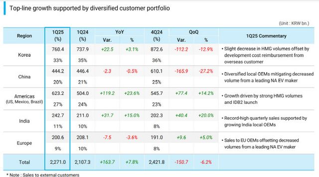 먼저 북미 지역의 현대차그룹(HMG), 중국·인도의 현지 완성차 업체(OEM) 등 핵심 지역 고객들의 강력한 수요가, 북미 전기차(EV) 제조업체의 모델 리프레시(신차 출시 전 일시적인 생산 중단)로 인한 영향을 효과적으로 상쇄했다. 아울러 올 1분기 평균 환율이 전년 동기 대비 9.4% 오른 1453원을 기록하는 등 우호적인 환율 환경이 매출에 긍정적인 영향을 줬다.