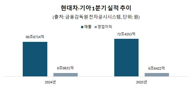 25일 금융감독원 전자공시시스템에 따르면 현대차·기아의 1분기 합산 매출액은 72조 4253억원, 영업이익은 6조 6422억원으로 잠정 집계됐다. 전년 동기 대비 매출은 8.3% 증가한 반면 영업이익은 4.9% 줄었다.