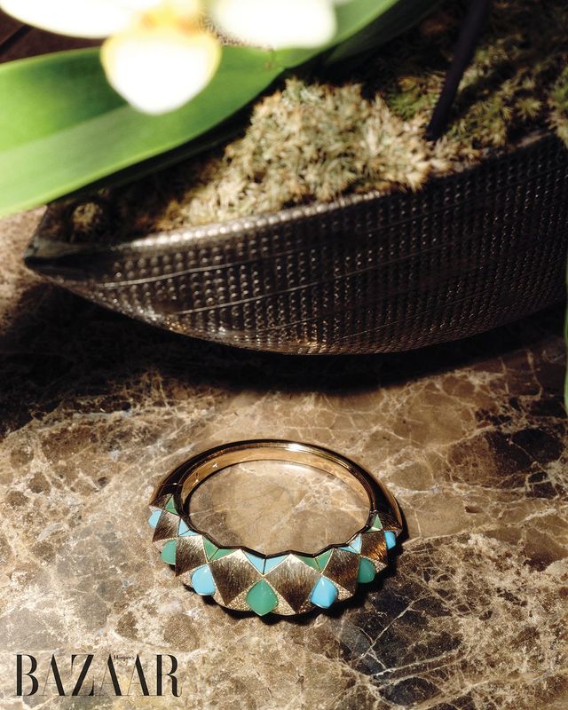 튀르쿠아즈·크리소프레이즈 세팅의 로즈 골드 ‘선라이트’ 브레이슬릿은 Piaget.