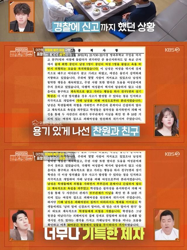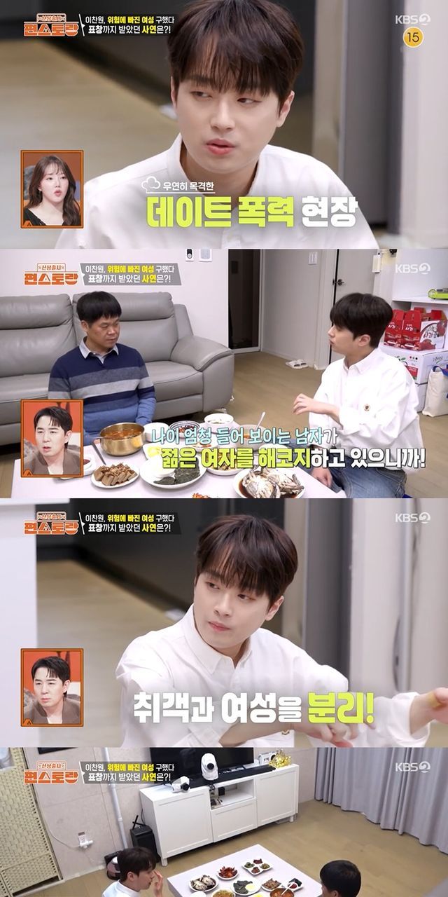 이찬원은 당시를 떠올리며 "친구를 만나러 가던 길이었다. 국밥집 앞에서 어떤 여성 분이 취객한테 너무 당하고 있었다. 지금으로 따지면 데이트 폭력 비슷하다"고 설명했다.