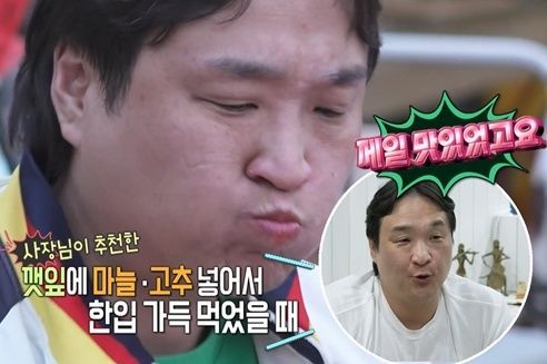 구성환은 깻잎에 곰장어를 무려 4점이나 올리고 고추와 마늘까지 더해 크게 쌈을 만들어 입안을 가득 채운다.