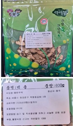 회수 대상은 ‘주식회사 중한무역(서울특별시 동대문구)’에서 수입한 중국산 삽주(백출)(생산년도: 2023년)와 이를 ‘샘그린유통(서울특별시 동대문구)’에서 소분·판매한 제품(소비기한: 2028.3.31.까지)이다.