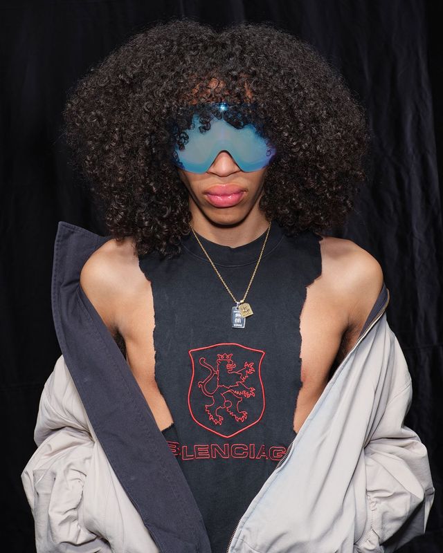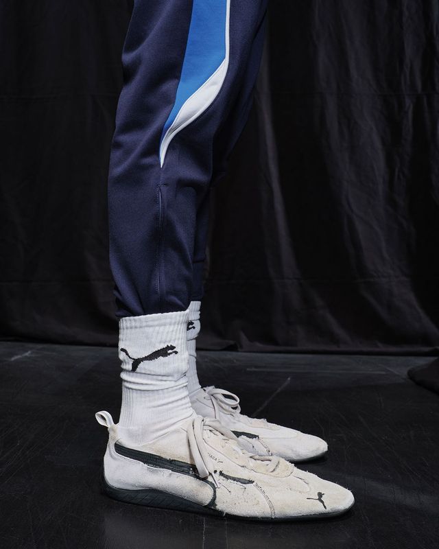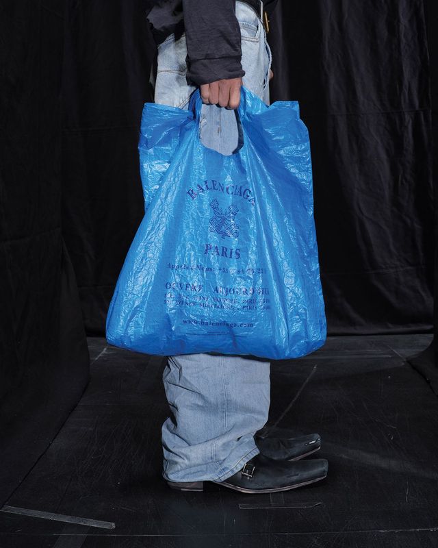 쇼 중반부엔 발렌시아가 팬이라면 열광할 협업 라인이 줄지어 등장했다. 아디다스에 이은 새로운 스포츠 브랜드, 푸마가 그 주인공. 시어링 재킷, 보머 재킷, 후디, 트랙수트, 목욕 가운까지 선보였는데, 아마도 가장 인기를 끌 아이템은 예상컨대 ‘울트라 소프트 스피드 캣’! 1988년 출시된 푸마의 대표 모델 ‘스피드캣 OG’를 재해석했는데, 찢겨지고 닳은 모습이 마치 10년은 거뜬히 신은 듯 거친 모습이었다. 또 비닐봉지를 닮은 ‘플라스틱 백’ 쇼퍼도 놓치지 말 것. 강철보다 15배 강한 내구성을 지닌 다이니마(Dyneema) 소재로 제작해 눈길을 끈다. 피어싱을 단 장갑과 헬멧, 얼굴 대부분을 가린 ‘베니스 비치 마스크’ 아이웨어는 꾸준히 관계를 이어온 모터사이클 브랜드 알파인스타즈(Alpinestars)와의 합작품이라고.
