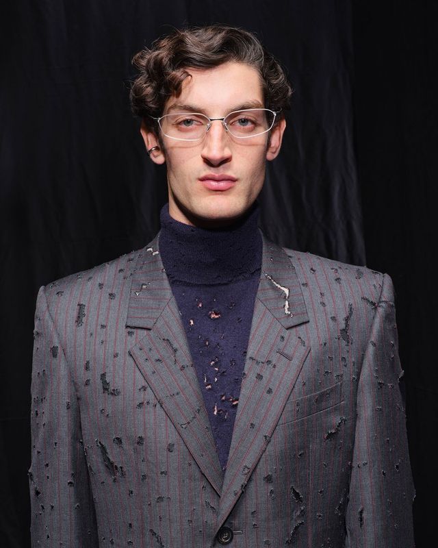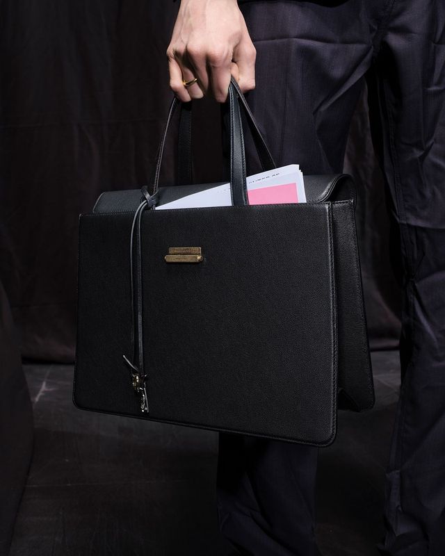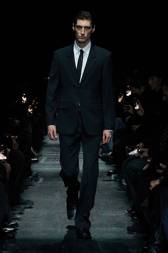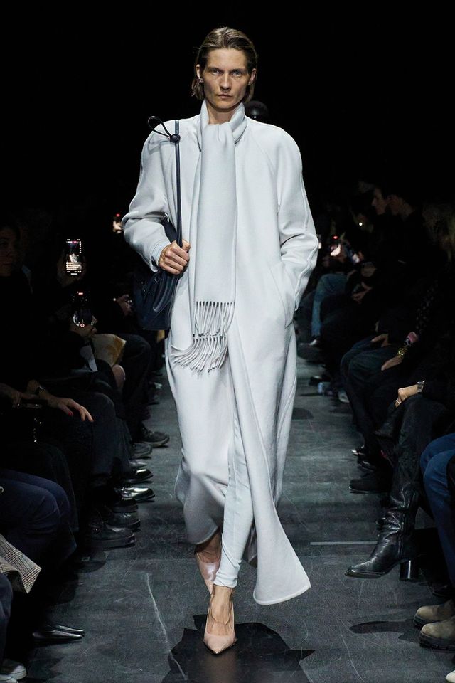 뎀나는 다시 본질로 돌아갔다. 쇼의 테마는 ‘표준(Standard)’. “저는 ‘코스튬’이라는 단어를 싫어합니다. 저로 하여금 꿈을 꾸지 않게 하기 때문이죠. 저를 꿈꾸게 하는 건 ‘수트’예요. 가장 어렵고, 동시에 제가 가장 잘하고 싶은 영역이기도 합니다.” 그의 말처럼 쇼의 오프닝은 가장 기본적인 블랙 수트였다. 그 뒤를 이은 건 화이트 셔츠, 피케 폴로, 초경량 푸퍼 재킷, 웨트수트 소재의 가죽 재킷 등 전형적인 사무직 회사원의 모습이다. 물론 뒤틀고 변형시키는 지극히 ‘뎀나다운’ 디테일도 빠지지 않는다. 손으로 구긴 듯한 디테일의 수트, ‘좀먹은’ 듯 구멍이 뚫린 핀스트라이프 수트, 재킷과 맥시스커트를 매치한 언밸런스한 조합이 바로 그것. ‘발렌시아가 회사원’들은 한 손에 휴대폰을 들거나 접착식 메모지가 붙은 A4 용지를 담은 서류가방을 든 채 런웨이를 걸으며 현실감 있는 모습을 더했다.