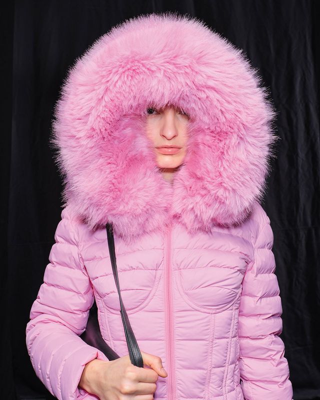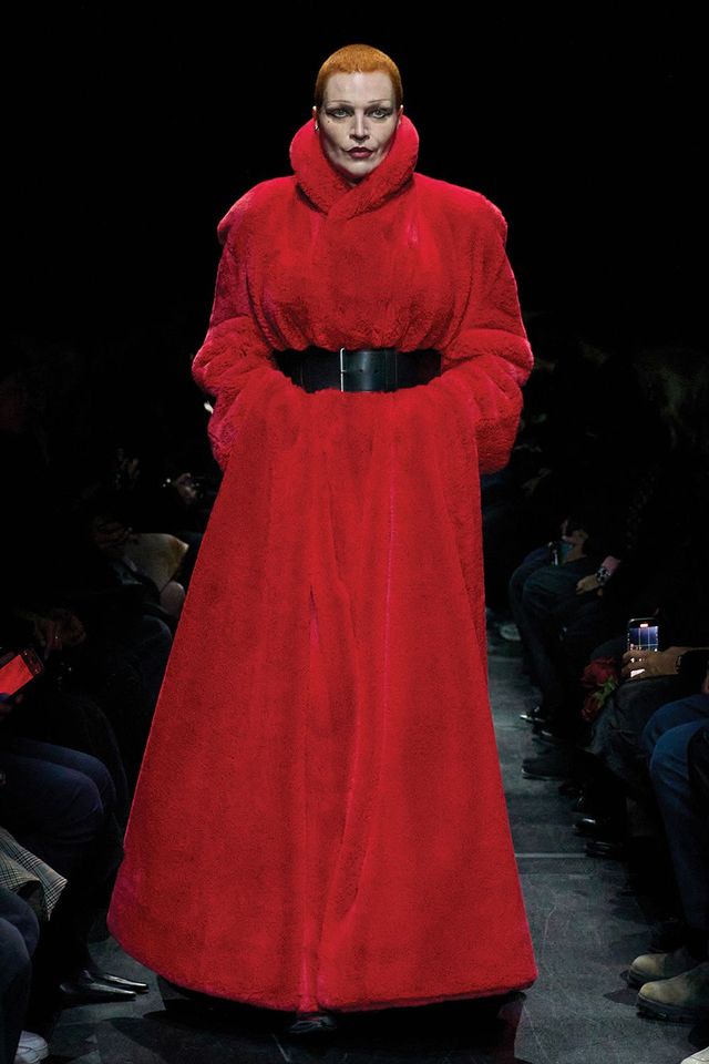 데이 웨어라 명명된 아이템들 역시 특유의 반항적인 뉘앙스를 곳곳에서 찾아볼 수 있었다. 부서진 단추를 단 코트부터 바닥에 질질 끌리는 길이의 메디치 칼라 카디건, 모래시계 형태로 조여진 벨티드 패딩, 소매가 댕강 잘린 티셔츠, 영구적으로 주름지게 만든 데님, 수영복과 결합한 스윔 드레스를 보라. 여기에 하우스의 1951년 세미 피티드 라인에서 영감을 얻은 시어링 파카와 1967년 웨딩드레스의 웅장한 볼륨감을 그대로 재현한 몰튼 맥시 후드로 크리스토발 발렌시아가가 남긴 위대한 유산을 오마주하기도.