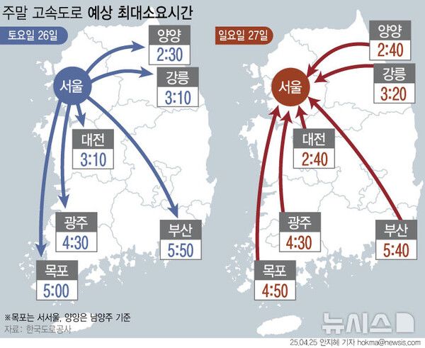오전 10시 요금소 기준 주요 도시 간 예상 소요 시간은 하행선 ▲서울~부산 5시간50분 ▲서울~대구 4시간50분 ▲서울~광주 4시간30분 ▲서울~대전 3시간 ▲서울~강릉 3시간10분 ▲서울~울산 5시간30분 ▲서울~목포 4시간50분이다.