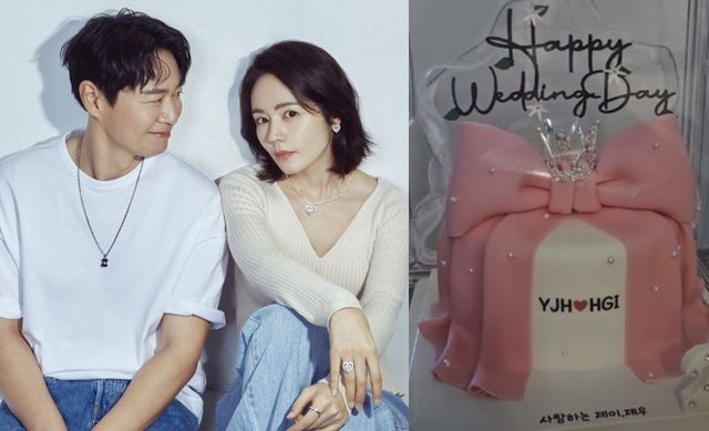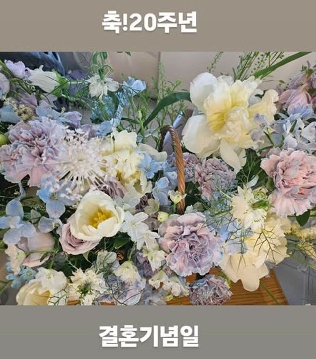 공개된 사진엔 20번째 결혼기념일을 자축하는 꽃다발과 케이크가 담겼다. 커다란 리본과 왕관으로 꾸며진 케이크엔 ‘YJH♥HGI’ ‘사랑하는 제이, 제우’라는 문구가 새겨져 특별함을 더했다. 제이와 제우는 부부의 자녀들로 이들이 부모님의 결혼기념일을 맞아 준비한 이벤트로 보인다.