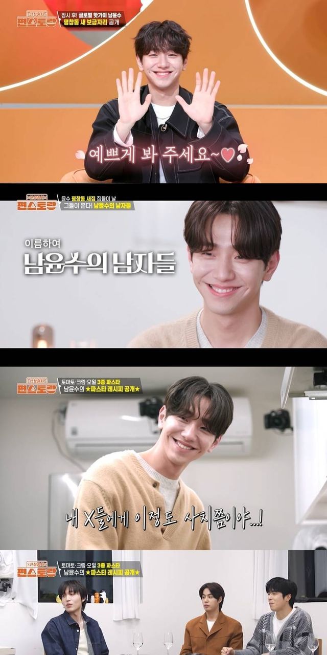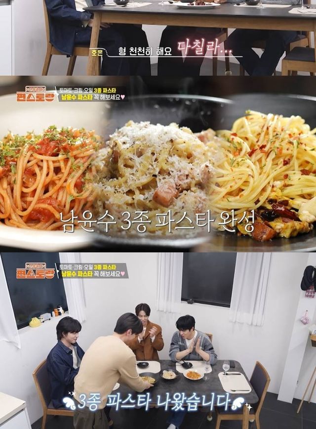 이어 권혁과 나현우가 도착했다. 형들의 등장에 ‘형바라기’ 진호은이 질투 아닌 질투를 해 폭소를 유발했다. 이렇게 꽃미남 4인방이 모인 가운데, 남윤수는 3종 파스타(토마토누룽지파스타, 달걀오일파스타, 양송이크림파스타)를 만들었다. 한 종류의 파스타도 만들기 쉽지 않은데, 남윤수의 3종 파스타는 누구나 쉽게 따라 할 수 있을 정도로 간단하고 꿀맛이라 감탄을 자아냈다.