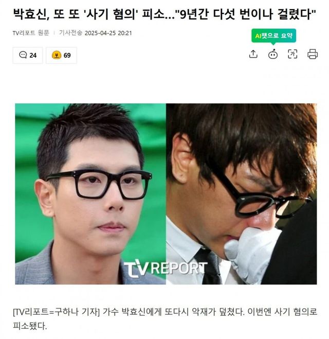 이 외에도 사업가 A씨는 지난 2019년 박효신이 승용차와 손목시계 등 4억 원 이상의 금품을 받은 뒤 가로챘다고 주장하며 그를 사기 혐의로 고소하기도 했다.