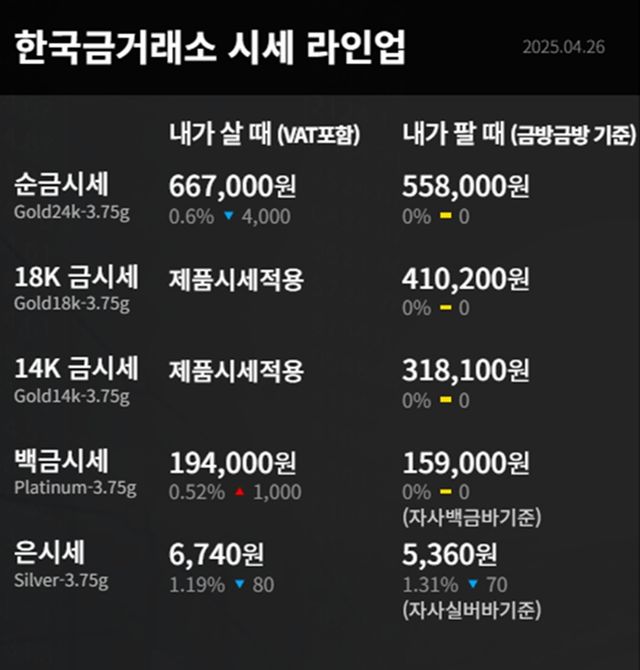 순금(24K) : 매입가 66만 7000원 / 매도가 55만 8000원