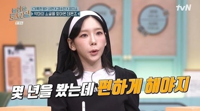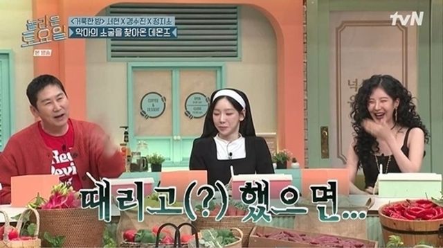 이날 놀토 멤버들은 ‘악마를 보았다’라는 주제에 맞춰 악마 콘셉트의 분장을 하고 나타났다. 태연은 막내 서현의 영화 홍보를 지원 사격하기 위해 수녀 복장으로 나타나 눈길을 끌었다.