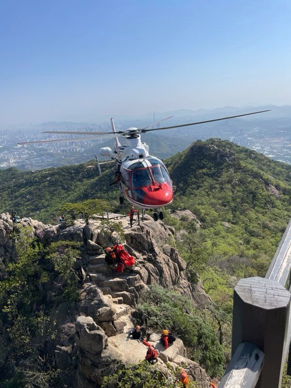 목격자 신고를 받고 출동한 소방 당국은 A씨가 떨어진 지점으로 헬기를 접근하게 한 뒤 인양 장치인 호이스트로 구조해 아주대 병원으로 옮겼다.