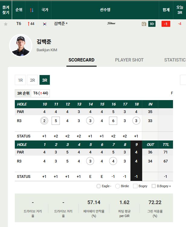 3R : 4언더파 67타 (이글 1개, 버디 4개, 보기 2개) 합계 1언더파 212타 공동6위