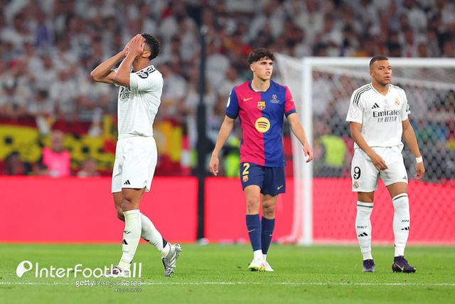 레알은 전반 34분 벨링엄이 골망을 흔들었지만 오프사이드로 판정되면서 취소가 됐다. 전반 43분 코너킥 상황에서 페란이 뒤로 흘린 공은 그대로 빗나갔다. 전반 추가시간 1분 비니시우스가 페널티킥 유도를 하려고 했지만 이전 상황에서 오프사이드로 판정돼 상황이 종료됐다. 전반 추가시간 5분 하피냐 슈팅은 막혔다. 전반은 바르셀로나의 1-0 리드 속 종료됐다.