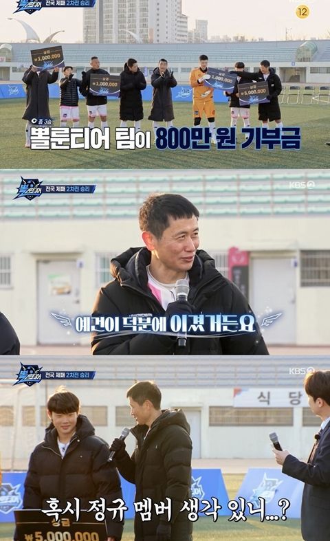 지난 26일 방송된 KBS2 '뽈룬티어'에서는 '이영표, 손흥민의 고향' 강원 연합과 엎치락뒤치락 치열한 승부를 벌인 끝에 '뽈룬티어'가 3승 2패로 값진 승리를 거뒀다. 상금 800만 원은 전액 산불 피해 복구 성금으로 기부했다. '뽈룬티어'는 1차전 경상 연합을 꺾고 획득한 상금 800만 원을 기부한 데 이어, 이번 2차전 상금 800만 원까지 총 1600만 원을 산불 성금으로 기부했다.