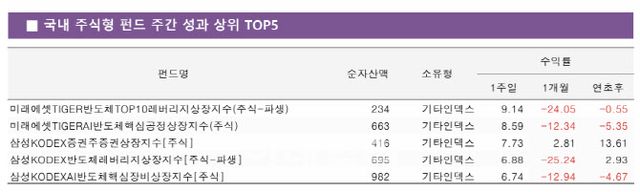 이외에 수익률 4~5위에 진입한 상품도 반도체 관련 상품으로 확인됐다. 수익률 4위는 ‘삼성 KODEX반도체레버리지 ETF’로 6.88%를 기록했다. 5위는 ‘삼성 KODEX AI반도체핵심장비 ETF’로 6.74%의 수익률을 나타냈다.