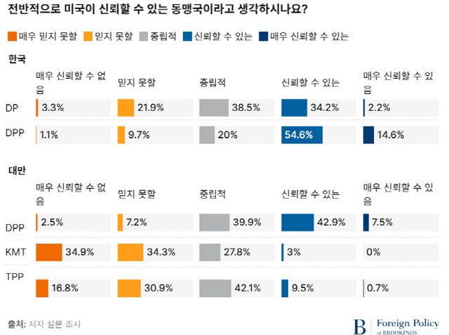 다만 높은 변화에도 불구하고 한국의 경우 미국에 대한 신뢰도가 전반적으로 더 높은 것으로 나타났는데 브루킹스연구소는 이는 양국의 안보관계가 본질적으로 다르기 때문이라고 설명했다. 한국은 미국과 상호방위원조협정을 체결한 군사동맹국인 반면, 대만은 그렇지 않다.