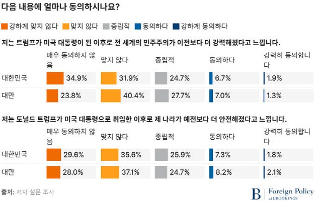 조사결과를 보고 브루킹스연구소는 “거의 모든 지표에서 미국은 이전보다 신뢰하기 어려운 파트너였으며, 한국과 대만 모두 권위주의 이웃 국가에서 갈등이 발생할 경우 미국이 자신들이 지원할 것이란 확신이 약해졌다”며 “트럼프 대통령은 전세계 민주주의에 해롭다고 생각했다”고 밝혔다.