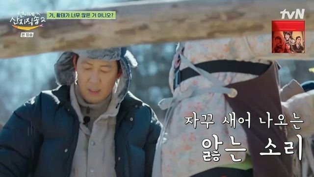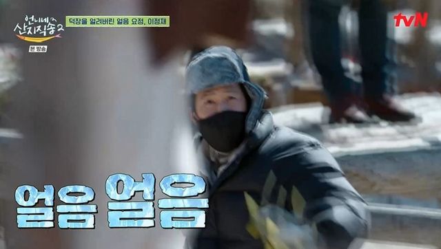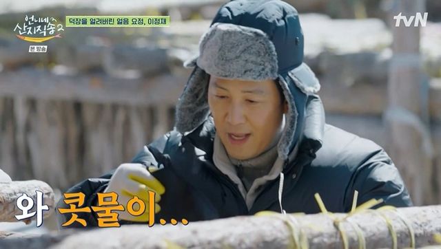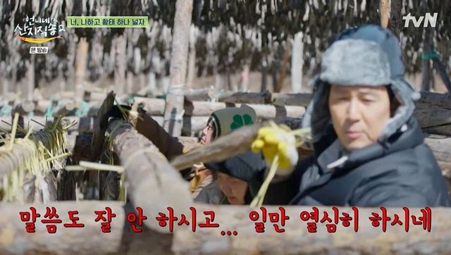 이날 염정아, 박준면, 임지연, 이재욱은 덕장에 이정재가 있는 건 까맣게 모른 채 황태를 너는 데 집중했다. 그때 이정재는 “거기다 널면 안 되지”라고 불호령을 내린 후 ‘오징어게임2’ 속 대사인 “얼음”이라고 밝혔다. 모두가 깜짝 놀라 이정재만 바라봤고, 염정아는 “고마워요”라고 전했다. 이정재는 첫 대면에 콧물을 닦으며 “콧물이 다 나네. 고생들 하신다”고 밝혔다.