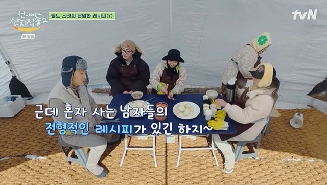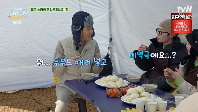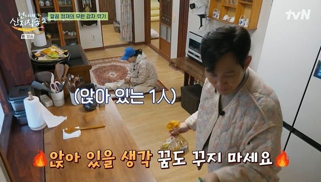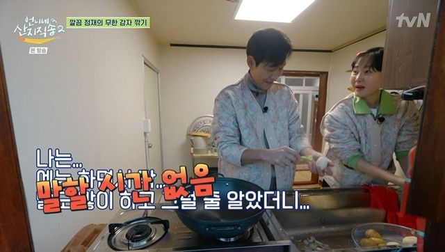 이정재는 불을 피우는 이재욱 옆을 서성이다 염정아의 호출에 달려갔다. 임지연이 수제비 반죽에 집중한 사이 박준면은 시래기를 삶았다. 이정재의 담당은 감자 까기. 이정재는 임지연에게 “왜 이렇게 바쁘냐. 정신이 없어”라고 토로했고, 임지연은 “제가 쉴 틈 없다고 했죠. 앉아 있을 생각은 꿈도 꾸지 말아라”고 밝혔다. 이정재는 염정아가 감자를 더 가져다주자 “큰일 났다. 난 예능 하면서 말도 많이 하고 그럴 줄 알았더니 말할 시간이 없다”며 웃었다.