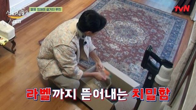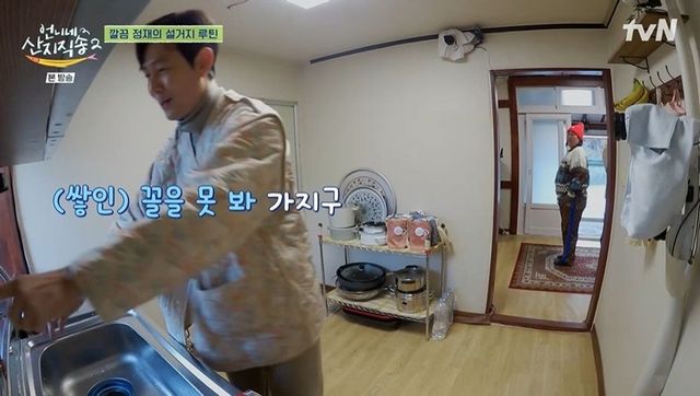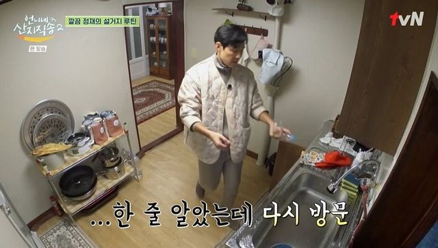 이어 본격적인 저녁 준비에 들어갔다. 냉장고를 연 이정재는 콩물을 보고 “콩물 남을 것 같은데?”라고 탐냈고, 염정아는 “집에 가져가도 된다”고 허락했다. 이정재는 콩물을 먹은 후 바로 설거지를 했고, 염정아가 “바로 치우는 스타일이구나?”라고 하자 이정재는 “(쌓인) 꼴을 못 본다”라며 다른 것들도 열심히 치웠다. 플라스틱병 라벨을 뗀 후 압축까지 하기도.
