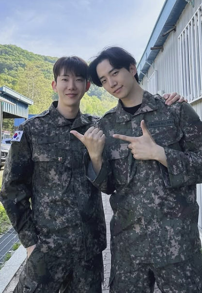 사진에는 예비군 훈련 중인 조권과 이준호의 모습이 담겼다. 두 사람은 과거 JYP엔터테인먼트에서 한솥밥을 먹은 사이로 각각 각각 그룹 2AM, 2PM 멤버로 활동했다.