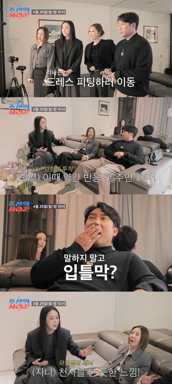 드레스 숍이 처음인 채리나-박용근 부부는 연신 눈을 동그랗게 뜨며 감탄했다. 곧이어 채리나가 드레스 피팅을 위해 커튼 안쪽으로 사라졌고, '유경험자' 민경은 "(신부가 드레스 입고) 열렸을 때 리액션이 제일 중요하다"며 "이때 반응 안 주면 화난다"고 조언을 건넸다. 지니도 "(리액션할 때) 말을 안 하는 게 나을 것 같다"며 진심 어린 감탄이 섞인 '구강 개방'이 포인트라고 꿀팁을 전수했다.