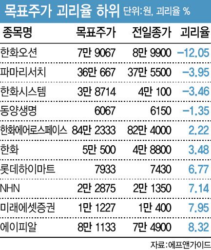 전체 상장사(증권사 3곳 이상 목표주가 제시) 가운데 현재 주가가 목표가보다 높은 곳은 4곳이다. 한화오션이 지난 25일 11% 넘게 급등(종가 8만 9900원)하면서 목표주가(7만 9067원) 괴리율이 -12.05%로 가장 크게 벌어졌고 파마리서치가 -3.95%, 한화시스템이 -3.46%로 뒤를 잇는다. 24일까지만 해도 파마리서치 목표가 괴리율이 최하위였다.