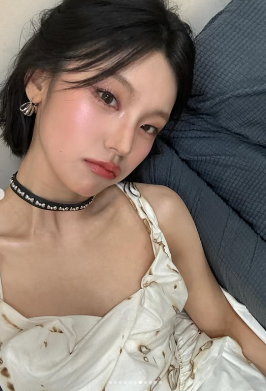 화이트 베이스에 나염 패턴이 들어간 원숄더 드레스를 입고, 침대에 기대어 찍은 셀카는 그야말로 청순 그 자체로군요.