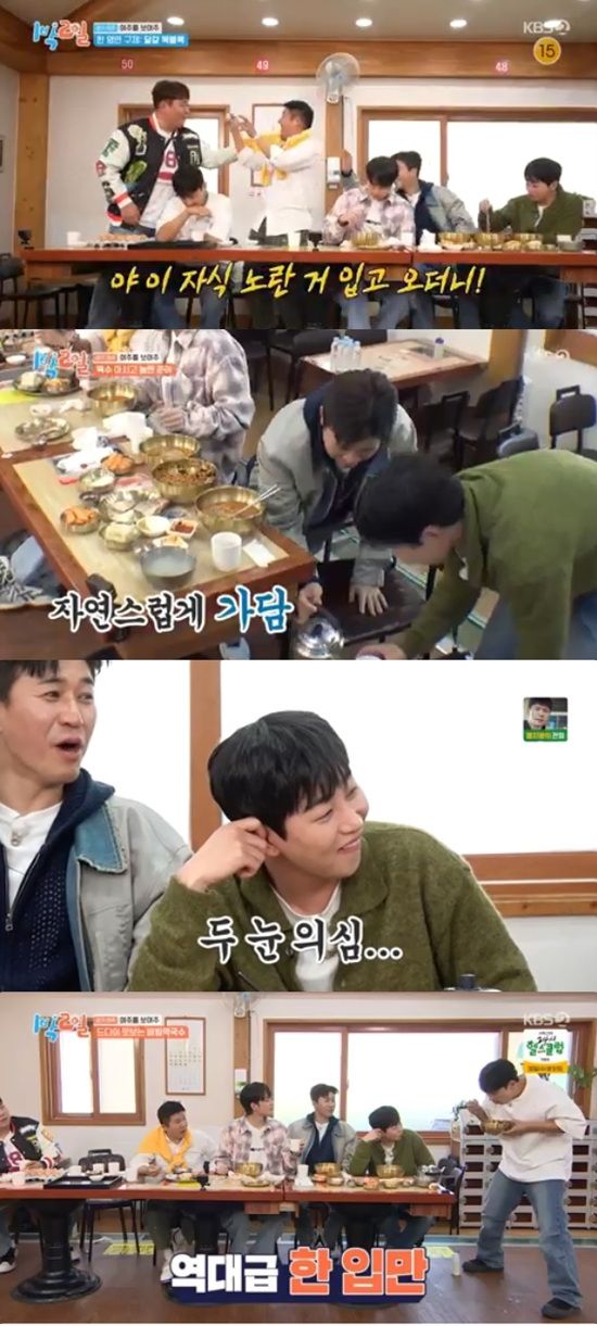 27일 방송된 KBS 2TV '1박 2일 시즌4'에서는 김종민, 문세윤, 조세호, 이준, 딘딘, 유선호가 경기 여주로 떠나는 모습이 전파를 탔다.