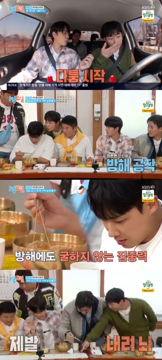 딘딘은 김종민 덕분에 점심을 획득하자 "너무 미안하다. 차에서 엄청 뭐라고 했는데"라며 김종민에게 잘 먹겠다고 얘기했다.