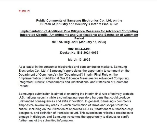 25일 미국 연방정부에 따르면, 지난달 삼성전자는 미국 상무부 산업안보국(BIS)에 '첨단 반도체 및 직접회로에 대한 추가 실사 조치'에 관한 잠정 최종 규칙에 대한 의견서를 제출했다. 삼성전자는 "규제가 미국 국가 안보를 보호하는 데 효과적이길 바라지만, 의도치 않은 결과로 혁신을 저해할 우려를 완화해야 한다"고 밝혔다. 중국에 대한 과도한 규제가 오히려 반도체 기술 독립을 촉진할 수 있다는 경고였다.