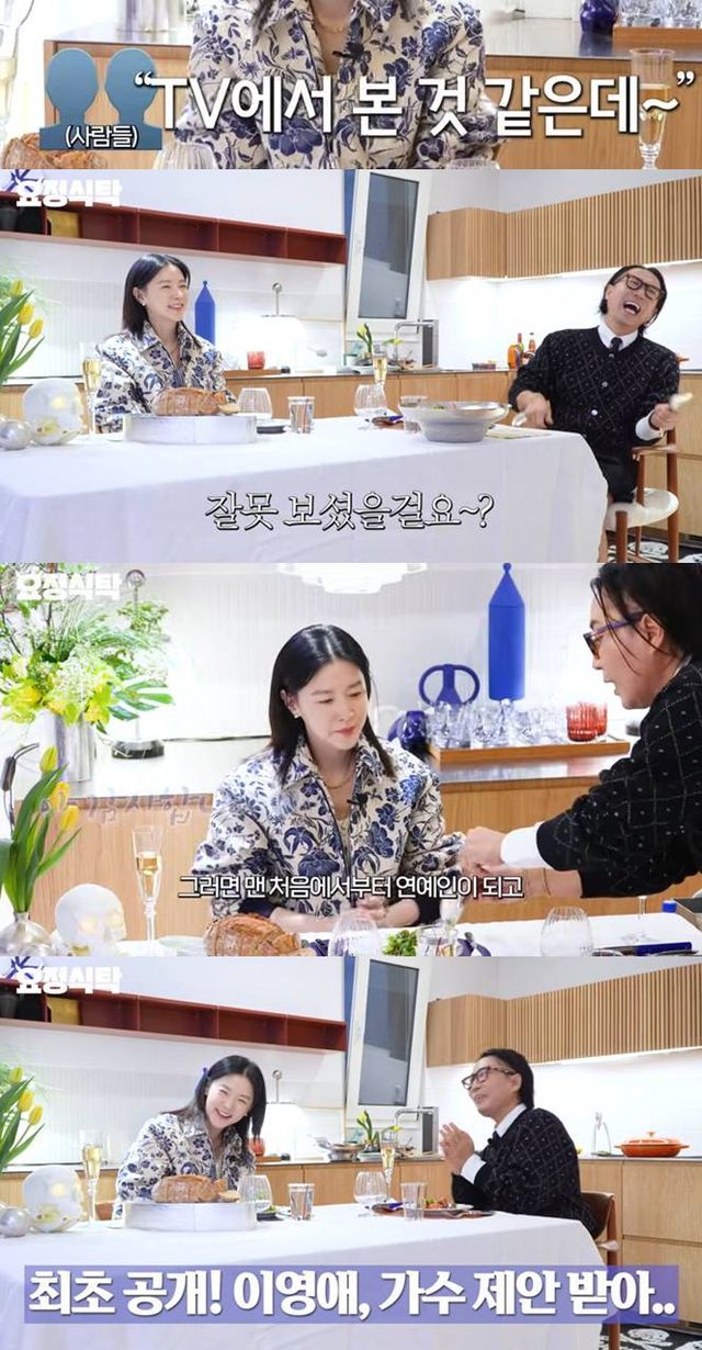 이영애는 "가수 프러포즈도 있었다"며 "엄정화 언니랑 같이 만날 수도 있었다"고 말해 놀라움을 더했다. 대학교 1학년 시절이었다는 이영애는 전속계약이었냐는 물음에 그렇다며 "제 노래도 듣지 않으시고. 그때는 이때처럼 아이돌이 붐업이 된 게 아니었기 때문에 무서웠었다"고 전했다.