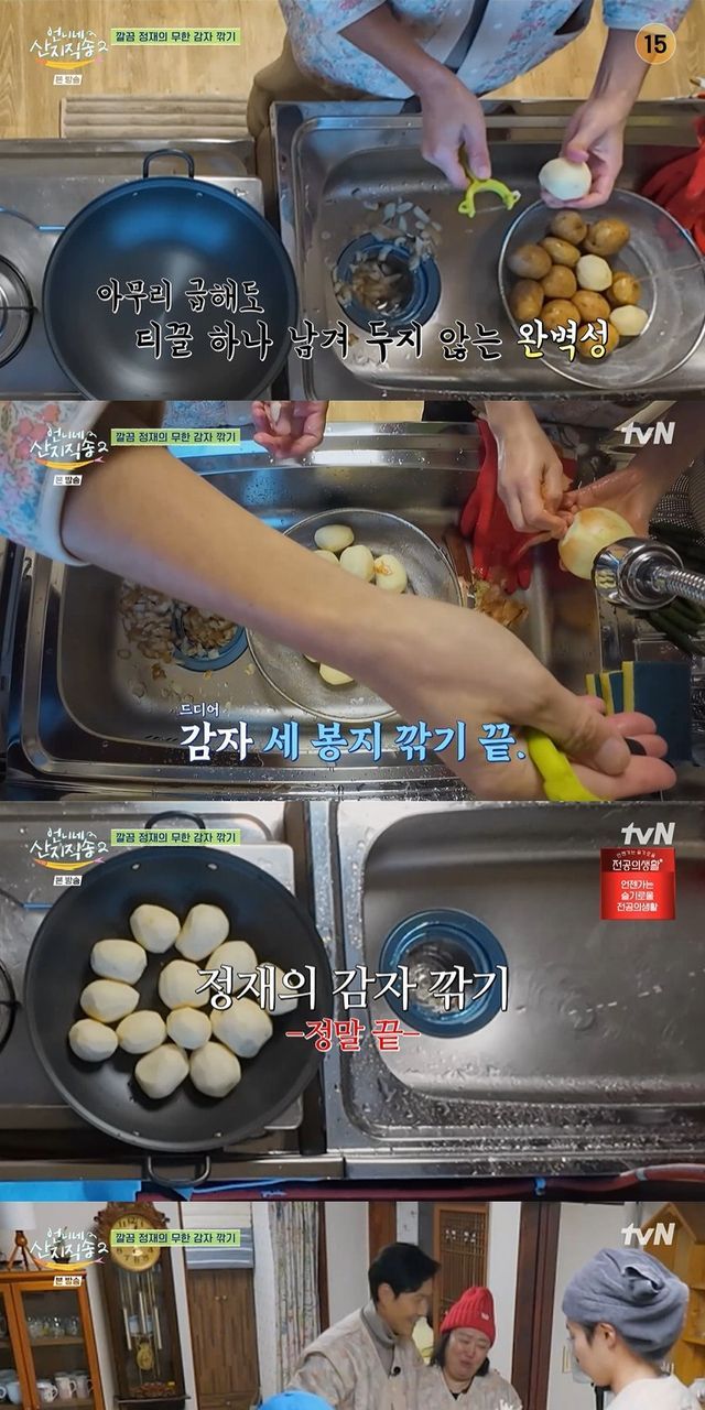 감자 세 봉지를 모두 깎은 이정재는 세척과 채망, 싱크대까지 완벽하게 정리해 그의 깔끔함에 감탄을 유발했다.