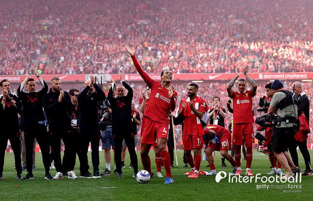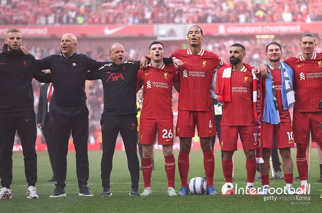 심판의 종료 휘슬이 울리자 리버풀 선수들은 모두 그라운드에 뛰어들어가 서로 부둥켜 안으며 기쁨을 만끽했다. 아르네 슬롯 감독도 스태프들과 서로 하이파이브를 하며 기뻐했다. 팬들은 리버풀의 대표 응원가인 ‘You’ll Never Walk Alone’을 불렀다.