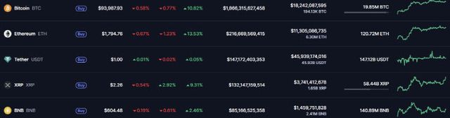28일 글로벌 가상자산 시황중계 사이트 코인마켓캡에 따르면 이날 오전 7시 57분 기준 비트코인 가격은 24시간 전 대비 0.77% 내린 9만 3987달러를 기록했다. 일주일 전과 비교하면 10.82% 올랐다. 알트코인(비트코인 외 가상자산)의 대표격인 이더리움은 전일 대비 1.23% 내린 1794달러에 거래됐다. 미국 증권거래위원회(ETF)가 프로쉐어가 요청한 리플 선물 상장지수펀드(ETF)를 승인했다는 소식에 리플(XRP)은 2.92% 상승한 2.26달러를 기록했다.