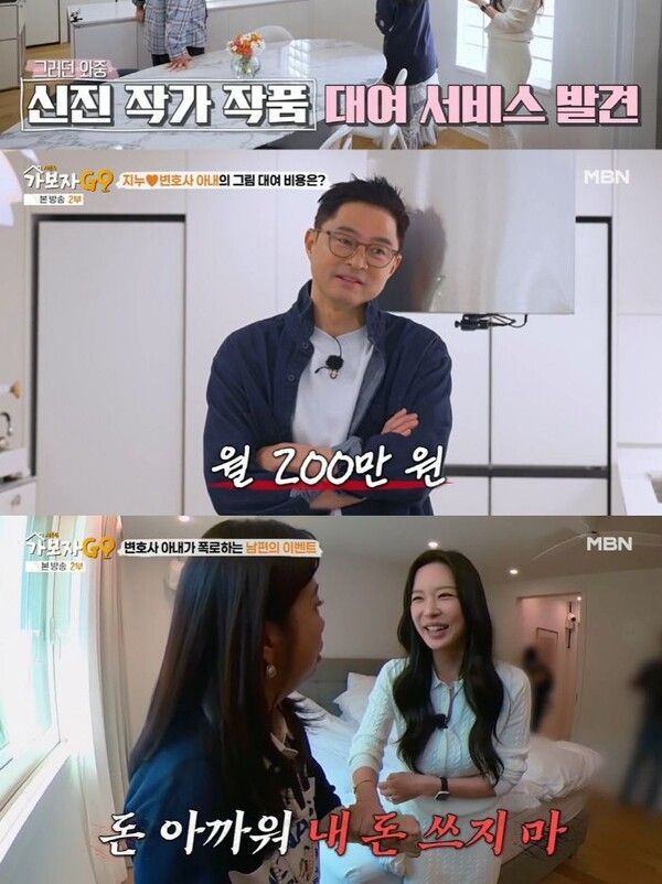 특히 임사라는 집안 곳곳에 걸린 감각적인 그림들에 대해 "남편과 그림을 공부하고 있는데 막상 그림을 사려니 비싸고 뭘 사야 될지 모르겠더라. 신진 작가 작품 대여 서비스가 있어서 이걸 이용하고 있다. 저희 집과 어울리는 그림을 큐레이터가 선정해 준다"고 설명했다. 지누는 "큰 그림은 비싸고 저희는 지금 4점을 붙였는데 월 2백만원을 내고 있다. 작품이 크고 좋을수록 비싸진다"고 덧붙여 안정환과 홍현희를 놀라게 했다.