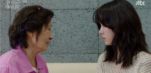 지난 27일 방송된 JTBC 토일드라마 ‘천국보다 아름다운’(연출 김석윤, 극본 이남규·김수진, 제작 스튜디오 피닉스·SLL) 4회에서는 ‘연적(?)’으로 만난 이해숙(김혜자 분), 솜이(한지민 분)의 관계에 변화가 찾아왔다. 솜이에게서 이영애(이정은 분)의 익숙한 흔적들을 발견한 이해숙이 그를 ‘영애’라고 확신했다.