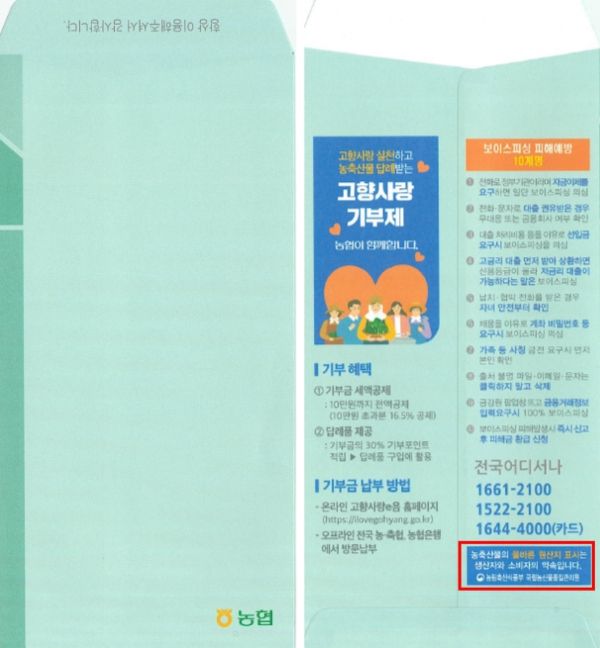 올해 4월부터 전국 NH농협 및 지역 농축협 5,957개소에서 사용하는 현금 봉투 2종(소형, 대형)에 농식품의 올바른 원산지 표시와 농축산물 유통 시 원산지 확인을 당부하는 공익광고 문구를 표시했다.