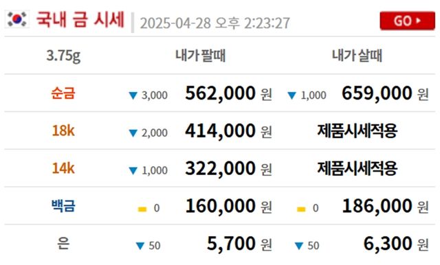 순금(24K) : 매입가 65만 9000원 / 매도가 56만 2000원