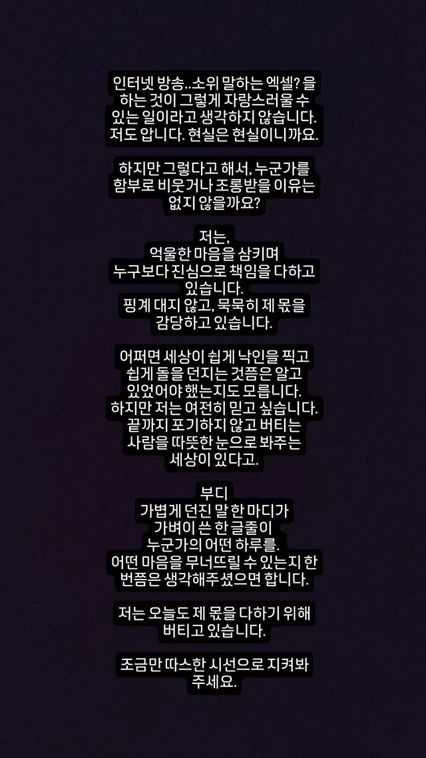 부디 가볍게 던진 말 한마디가 가벼이 쓴 한 글줄이 누군가의 어떤 하루를 어떤 마음을 무너뜨릴 수 있는지 한번쯤은 생각해주셨으면 합니다.