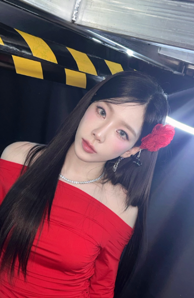 이어 공개된 또 다른 사진에서는 붉은 장미를 머리에 꽂고 빨간 오프숄더 드레스를 입은 태연이 등장합니다. 한층 또렷해진 눈매, 도발적인 레드립 메이크업과 함께 완전히 다른 매력을 선보였어요.