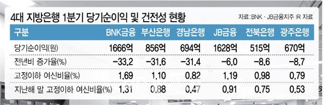 28일 금융권에 따르면 올 1분기 BNK금융 당기순이익은 1666억원으로 1년 새 33.2% 감소했다. JB금융 실적은 1628억원으로 1년 전보다 6.0% 줄었다.