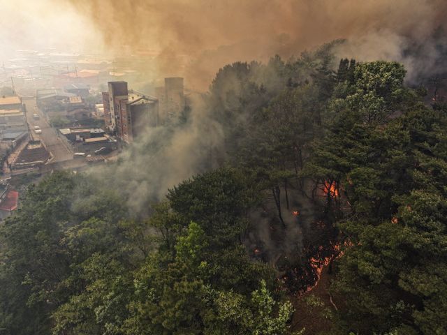 국가소방동원령이 발령된 가운데 소방당국은 민가 피해를 막기 위해 방화선을 치고 건축물에 물을 뿌리는 등 불길 차단에 주력하고 있다.